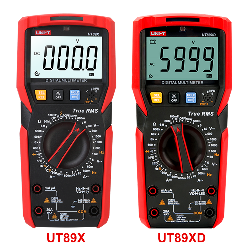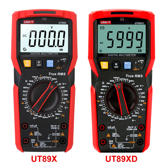 UT89X/UT89XD digital multimeter is a reliable hand-held 3 5/6 bit digital multimeter with true RMS sine wave measurement. It can measure Max. 1000V DC/AC voltage, Max. 20A DC/AC current, resistance, capacitance, frequency, diode, hFE, continuity and NCV, quickly distinguishing between neutral and live wires accurately.