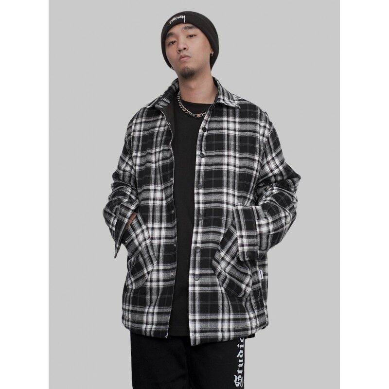 法兰绒加厚夹棉冬季拼皮格子棉衣男高街嘻哈潮牌棉服外套INS