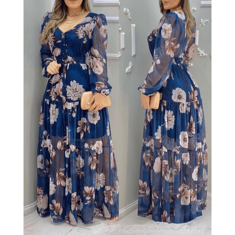 Women's 2021 New Summer Blue Printed Chiffon Dress-With Lining